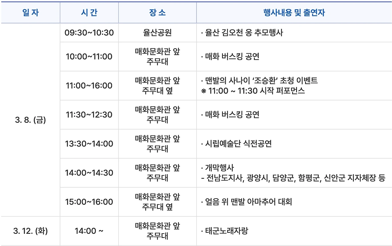 축제 기간 동안에는 다양한 프로그램이 준비되어 있습니다. 매일 오전 10시부터는 매화길 힐링 걷기 행사와 광양시립예술단의 공연이 열립니다.